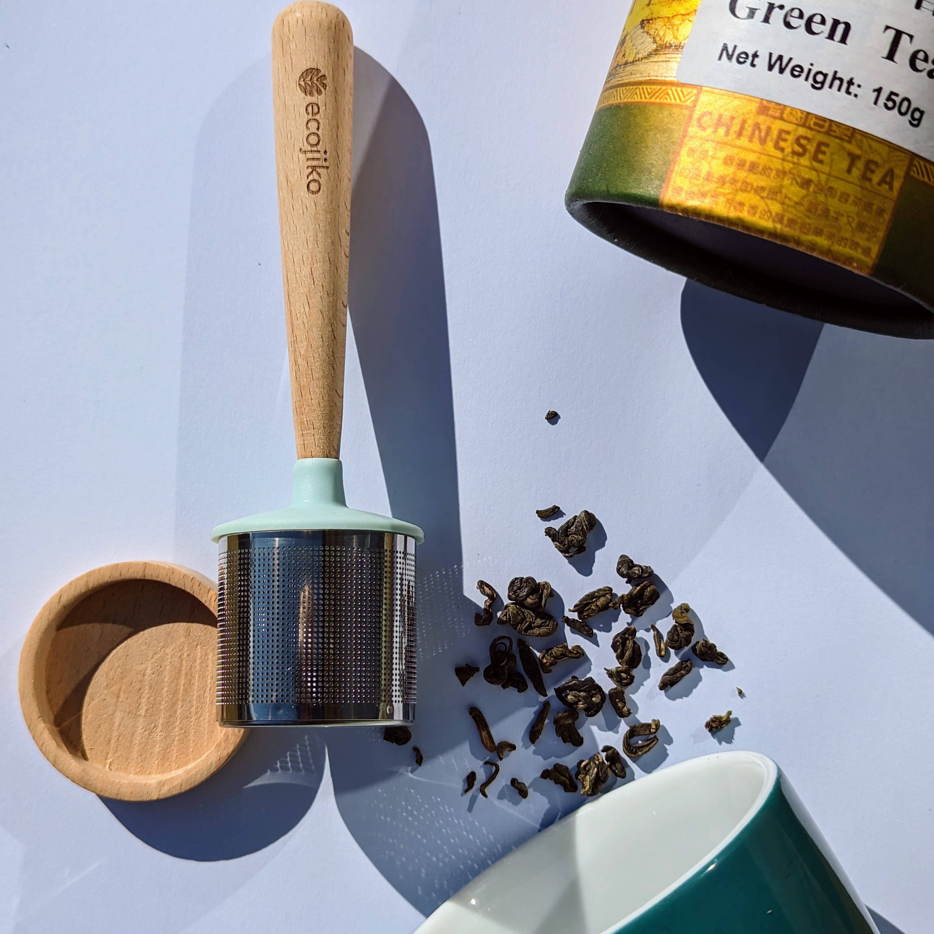 Spoon your loose tea leaves into the stainless steel and beech wood tea infuser and stir into boiling water to make the perfect eco friendly cup of tea. The cap is made from 100% food grade silicone.