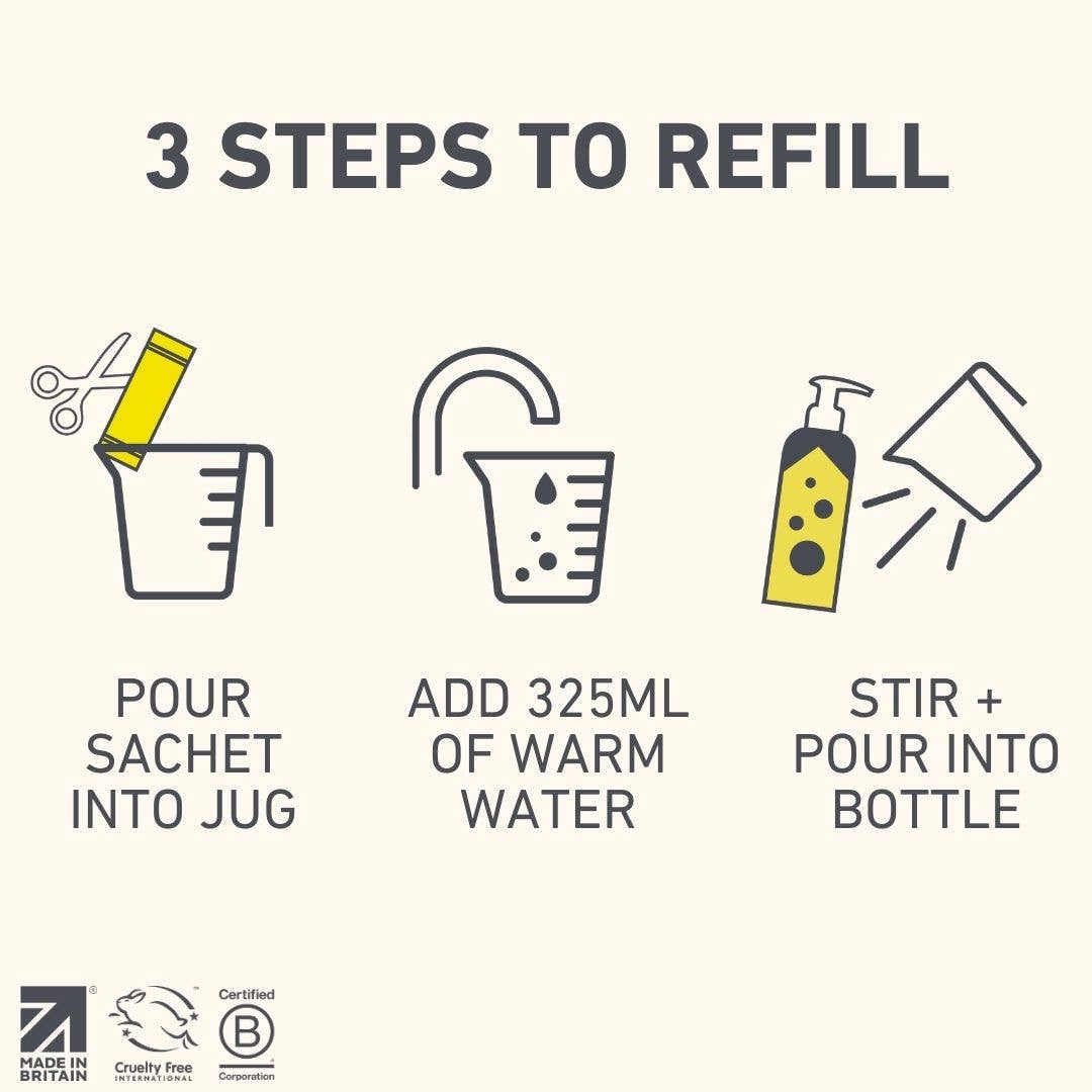 Each pack contains one 100% post-consumer recycled plastic refillable bottle and one powder-to-gel sachet to make 350ml of effective eco washing up liquid. Just add tap water at home.
